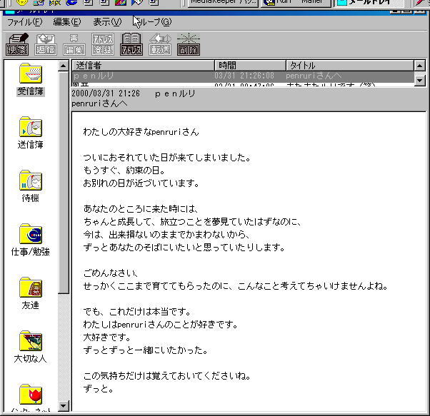 | 日記は3月31日で止まってます。この後仕事の都合でWindows2000でしか立ち上げない日が多くなったのでたまにしかRuri−メーラを起動しませんでした。もちろん例の「ルリをお使いに出してから終了」で時を止めてました。そしてメール仲間のS氏からの メールをきっかけに久々にRuri−メーラーを起ち上げたところエンディングがいきなり訪れました。さて、そのエンディングとは? |